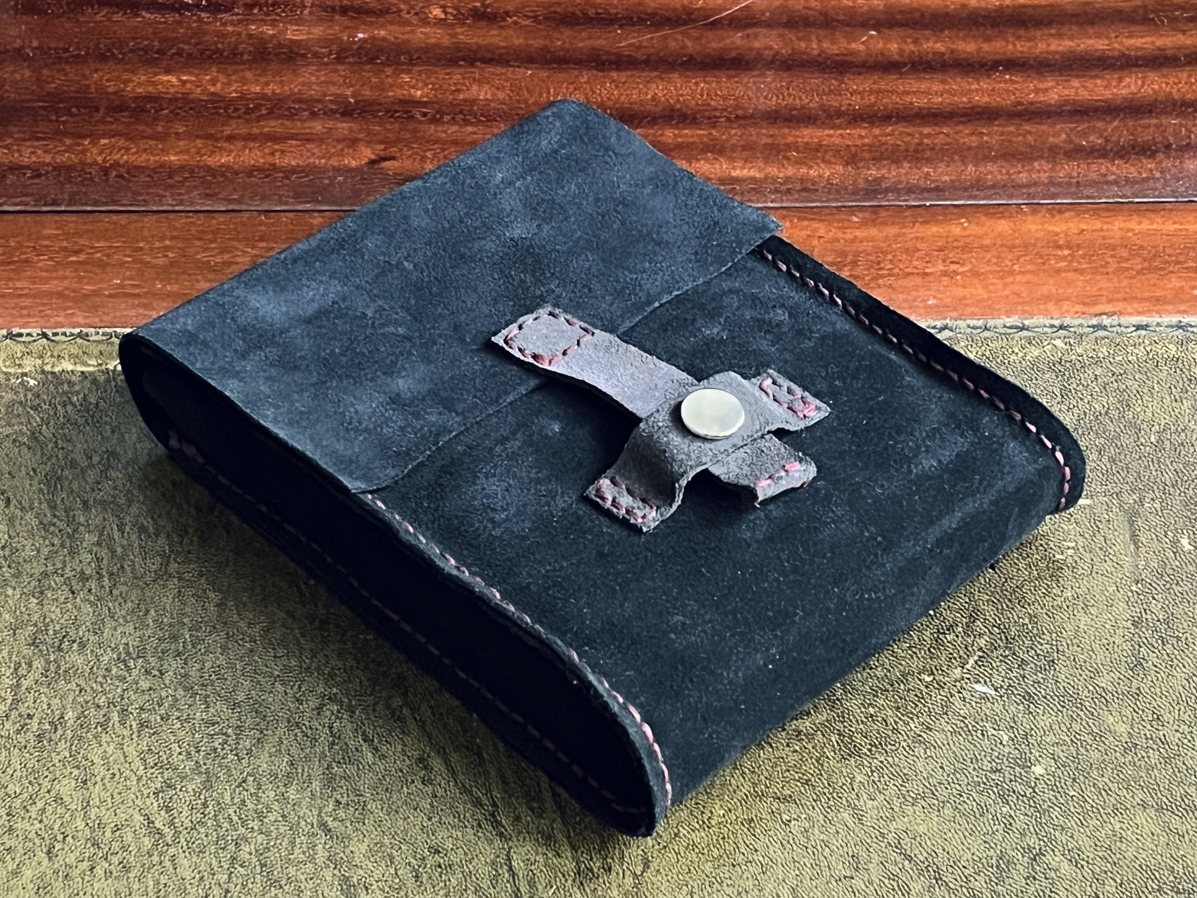 I made a leather pouch for my uConsole since I carry it around a lot at university in a larger bag with all sorts of things so it needs some protection. It’s made from suede leather so it’s relatively soft. The latch closes with a snap button.