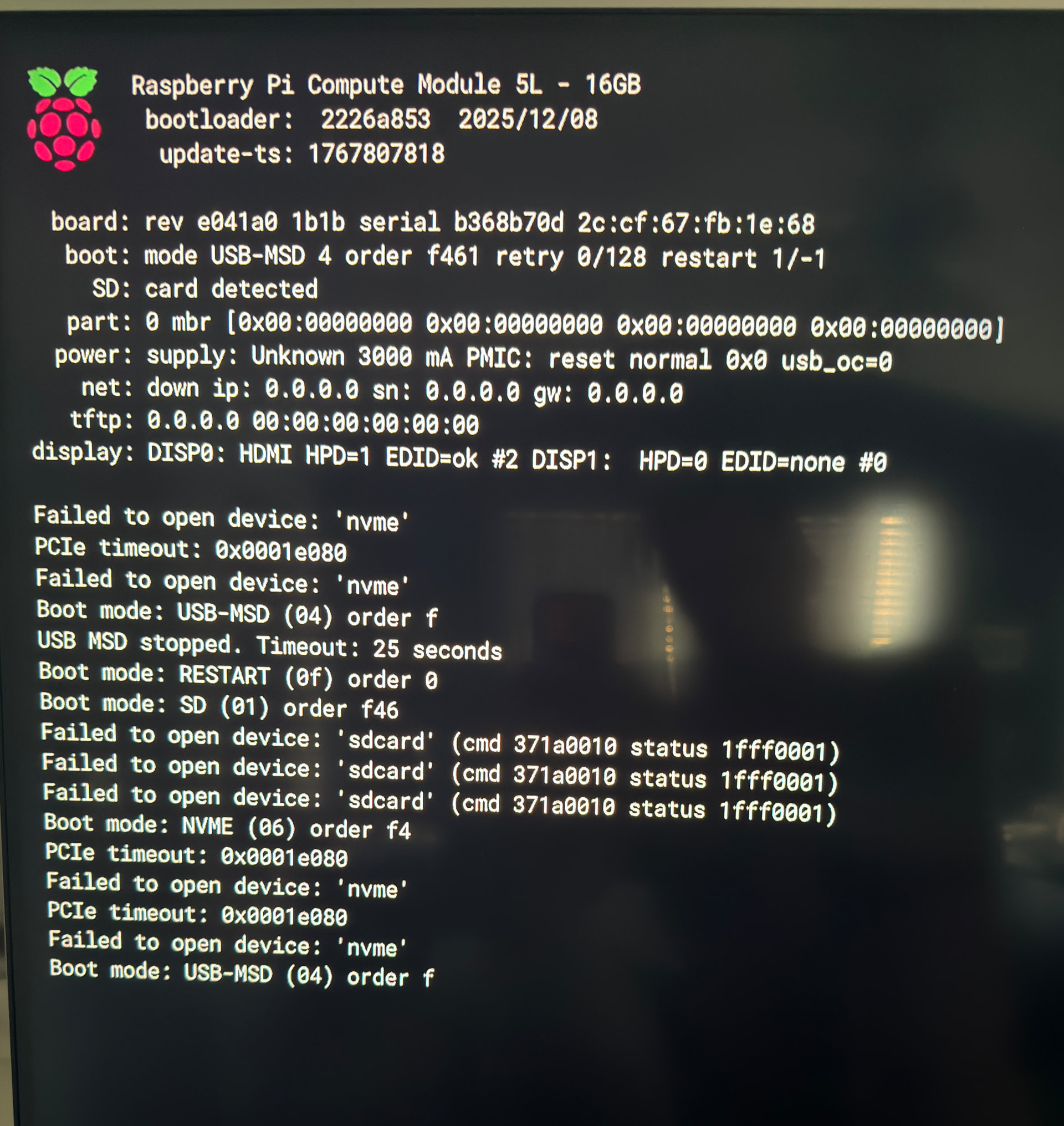 i did then re-seat the CM5 a few times… re-inserted the carrier board, rubbed the connectors… it was almost like there was a “coat” of something on the connectors that needed to be cleaned off. This happened not just for the CM5 but the ribbon cables as well. (remember the old nintendo catridges? this was also something that we did when we used to get new RAM back in the 90s)